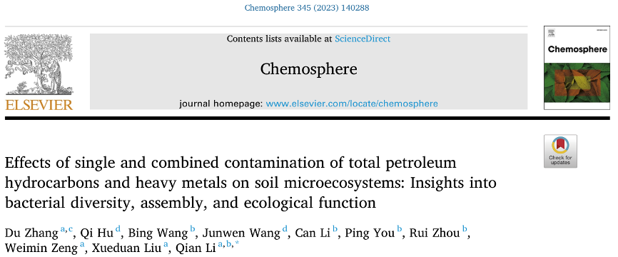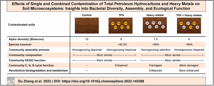 2023年9月30日,中南大學張杜博士為第一作者、李騫教授為通訊作者在《Chemosphere》雜志上發(fā)表題為“Effects of single and combined contamination of total petroleum hydrocarbons and heavy metals on soil microecosystems: Insights into bacterial diversity, assembly, and ecological function”的研究論文,該研究采用16S rRNA測序技術,研究了總石油烴(total petroleum hydrocarbons,TPH)單一污染、重金屬單一污染以及總石油烴-重金屬復合污染的土壤微生物群落特征,并與相應的低污染對照進行比較。