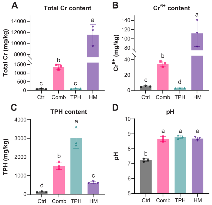 注:重金屬總量、水溶性含量、DTPA可提取量、TPH和pH值以平均值±SD(標準差)表示,n=3。一行中不同字母表明組間存在統(tǒng)計學顯著差異,p<0.05。污染物總量方面,星號(*)表示工業(yè)用地土壤環(huán)境質量國家標準(GB36600-2018)(Cr6+、Cu、Pb、Ni、TPH)和湖南省標準(DB43/T165-2016)(Cr和Zn)中含量超過開發(fā)用地土壤污染風險篩選值的污染物。對于水溶性含量,“#”是指含量超過GB14848-2017中IV類的污染物。“-”表示低于檢測限值。