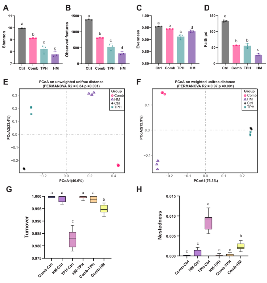 圖2:Ctrl組、TPH組、HM組和Comb組土壤微生物多樣性變化。