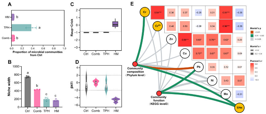 探究總石油烴(TPH)和重金屬單一及復合污染對土壤微生態(tài)系統(tǒng)的影響對于生態(tài)環(huán)境(生境)修復至關重要,但目前尚不完全清楚。本研究采用高通量測序方法研究了單一TPH污染、單一金屬污染及其復合污染對土壤微生物多樣性、組裝機制、組成、生態(tài)功能和抗性的影響。研究結果顯示,污染導致α多樣性減少,與復合污染相比,單一污染顯示較低的多樣性,這取決于污染物濃度。群落β多樣性主要受周轉(turnover)而非嵌入(nestedness)驅動,在污染條件下,群落的生態(tài)位較窄。中性群落模型(neutral community model,NCM)表明,在單一TPH或復合污染條件下,均質分散在群落組裝過程中起重要作用,而在重金屬污染條件下,均質選擇起主導作用。Procrustes分析揭示了群落組成與功能差異之間的相關性,而Mantel分析則將這種差異與Cr、Cr6+、Pb和TPH的濃度相關聯(lián)。結果顯示,TPH和重金屬復合污染的土壤表現(xiàn)出與單一金屬污染的土壤具有相似的屬、群落功能和抗性,突顯了重金屬的顯著影響。與碳(C)、氮(N)和硫(S)循環(huán)相關的生態(tài)功能在TPH污染下增強,但在重金屬脅迫下受損。這些研究結果增強了對TPH、重金屬及其復合污染下土壤微生態(tài)系統(tǒng)的理解,并對環(huán)境微生態(tài)和污染物風險評估具有重要意義。