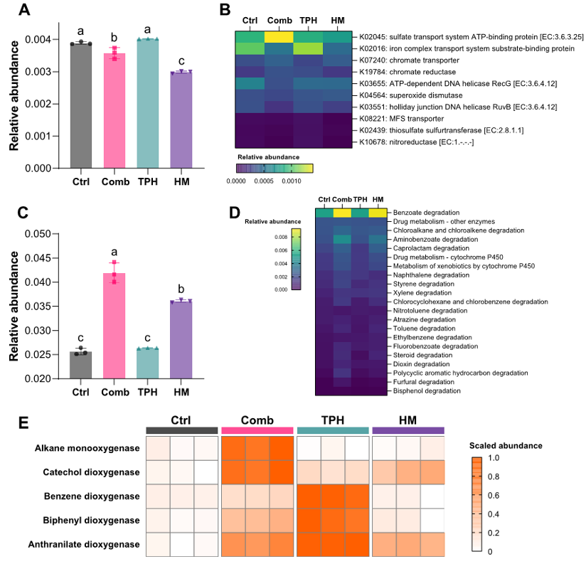 E. 熱圖顯示石油烴降解酶(essential hydrocarbon-degradation enzymes)的豐度差異。組間比較采用Mann-Whitney U檢驗。不同字母表示組間有統(tǒng)計學顯著差異,p < 0.05。