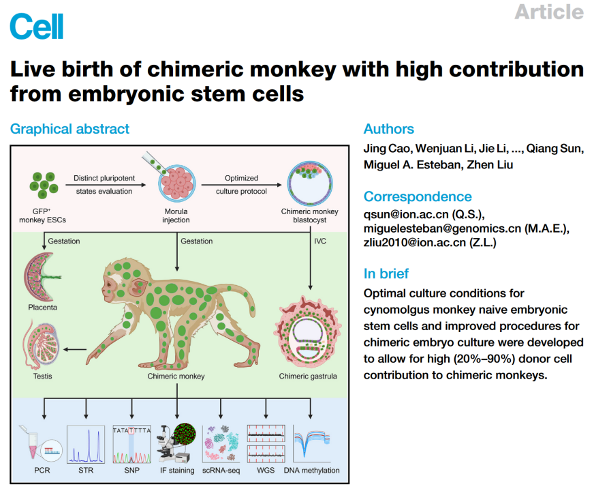 北京時(shí)間2023年11月9日,《Cell》期刊以封面文章的形式在線發(fā)表了由中國(guó)科學(xué)院腦科學(xué)與智能技術(shù)卓越創(chuàng)新中心(神經(jīng)科學(xué)研究所)、上海腦科學(xué)與類腦研究中心,中國(guó)科學(xué)院廣州生物醫(yī)藥與健康研究院等單位牽頭,題為《Live birth of chimeric monkey with high contribution from embryonic stem cells》(高比例胚胎干細(xì)胞貢獻(xiàn)的出生存活嵌合體猴)的研究論文,該研究在國(guó)際上首次成功構(gòu)建了高比例胚胎干細(xì)胞貢獻(xiàn)的出生存活嵌合體猴,并證實(shí)了猴胚胎干細(xì)胞可以高效地貢獻(xiàn)到胚外胎盤組織和生殖細(xì)胞。