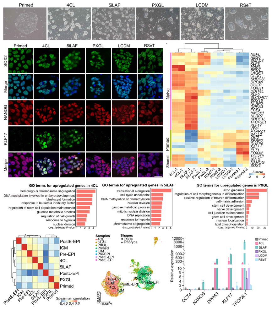 此外,經(jīng)RNA測(cè)序(RNA-seq)檢測(cè),在所有轉(zhuǎn)化的ESC中,多個(gè)原始ESC富集基因下調(diào),而在4CL和5iLAF ESC中,原始多能性網(wǎng)絡(luò)被更強(qiáng)地激活?;虮倔w(GO)分析顯示,在4CL和5iLAF ESCs中,與干細(xì)胞群體維持和DNA修飾相關(guān)的基因表達(dá)豐富,而在PXGL ESCs中,軸突導(dǎo)向和神經(jīng)分化相關(guān)基因表達(dá)豐富。這些結(jié)果表明,4CL和5iLAF ESCs的原始狀態(tài)穩(wěn)定,但PXGL ESCs的幼稚狀態(tài)不穩(wěn)定,這反映了物種對(duì)這種培養(yǎng)基反應(yīng)的特異性差異。然后,此研究通過(guò)基于液滴的單細(xì)胞RNA測(cè)序(scRNA-seq)研究了猴子的原始ESCs和在4CL、5iLAF和PXGL培養(yǎng)的ESCs的發(fā)育狀態(tài)。相關(guān)性分析和均勻流形近似與投影(UMAP)顯示,4CL和5iLAF ESCs更接近于ICM和植入前的上胚層,primed ESCs更接近于植入后晚期的上胚層,而PXGL ESCs則同時(shí)位于這兩個(gè)分組中(圖1)。