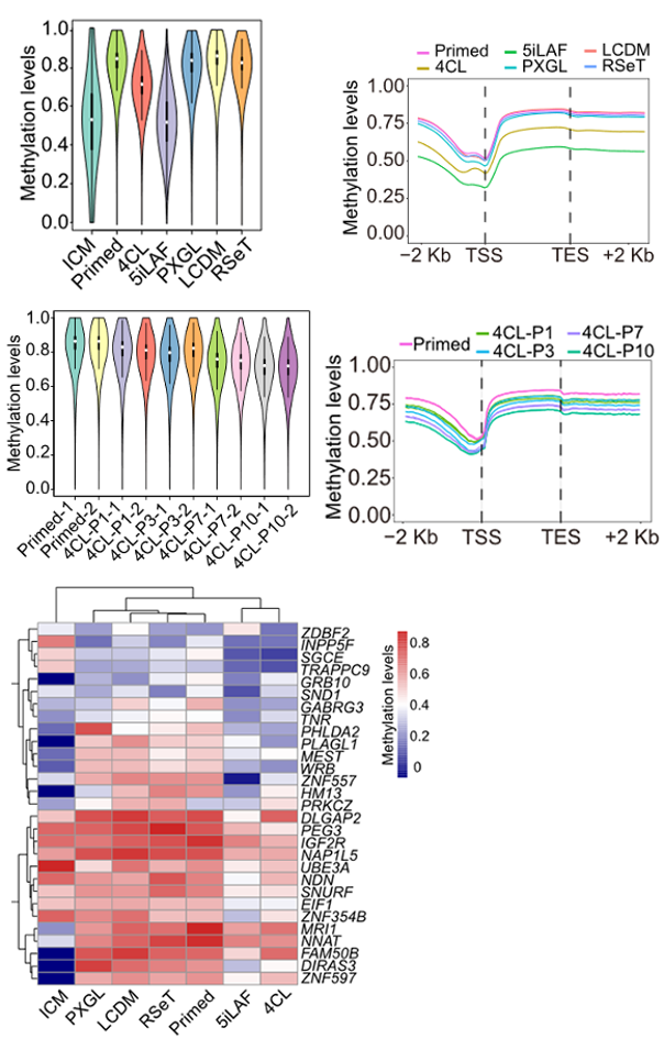 由于DNA去甲基化是一種表觀遺傳學(xué)機(jī)制,通過(guò)這種機(jī)制,原始ESC可轉(zhuǎn)化為幼稚多能狀態(tài),因此研究進(jìn)行了微量DNA全基因組亞硫酸氫鹽測(cè)序(Micro-WGBS)。結(jié)果表明,在RSeT、PXGL和LCDM中培養(yǎng)的ESCs的DNA甲基化水平較高(83%-86%),與原始ESCs的水平相似;4CLESCs的水平較低(72%),而5iLAFESCs的水平最低(52%),4CL和5iLAFESCs顯示的印記基因DNA甲基化模式與ICM更為接近(圖2)。