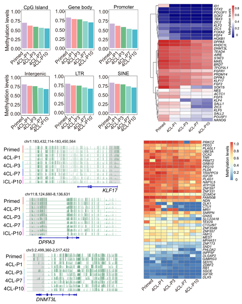 圖3. 在1、3、7和10個(gè)傳代的原始條件和4CL原始條件下培養(yǎng)的ESC,在不同基因組區(qū)域,原始多能基因,原始多能性位點(diǎn)以及印記基因啟動(dòng)子區(qū)域的DNA甲基化水平。