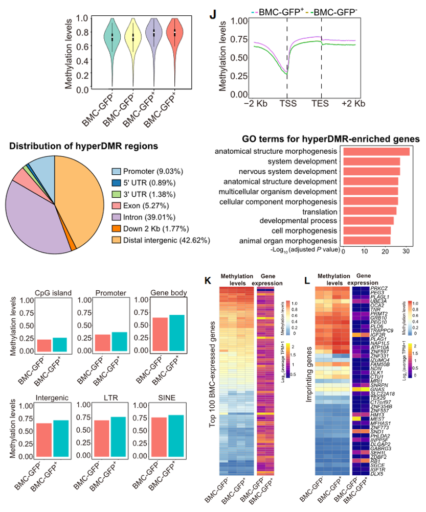 圖4. GFP+BMC和GFP-BMC整體、TSS,TES,不同基因組區(qū)域的DNA甲基化水平以及GFP+BMC在整個(gè)注釋基因組中高甲基化區(qū)域分布,啟動(dòng)子區(qū)域DNA甲基化水平與BMC表達(dá)基因與印記基因的表達(dá)水平聚類熱圖