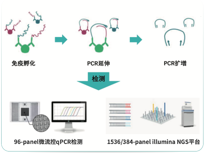鄰近延伸分析 (PEA) 是一種超多重免疫分析(包括48,96,384,1536和3072重指標(biāo)規(guī)格),用于高通量檢測(cè)液體樣品中的蛋白質(zhì)生物標(biāo)志物。 對(duì)于每個(gè)生物標(biāo)志物,都設(shè)計(jì)并篩選出獨(dú)特的一對(duì)匹配抗體與之臨近的兩個(gè)抗原表位結(jié)合,每一個(gè)抗體重鏈標(biāo)記有互補(bǔ)的寡核苷酸探針。當(dāng)特異性結(jié)合靶蛋白時(shí),探針?lè)浅=咏⑾嗷ルs交。 添加 DNA 聚合酶導(dǎo)致雜交寡核苷酸的延伸,與探針之一結(jié)合,產(chǎn)生 DNA 擴(kuò)增子,隨后可以通過(guò)定量實(shí)時(shí) PCR 或 NGS 檢測(cè)和量化。